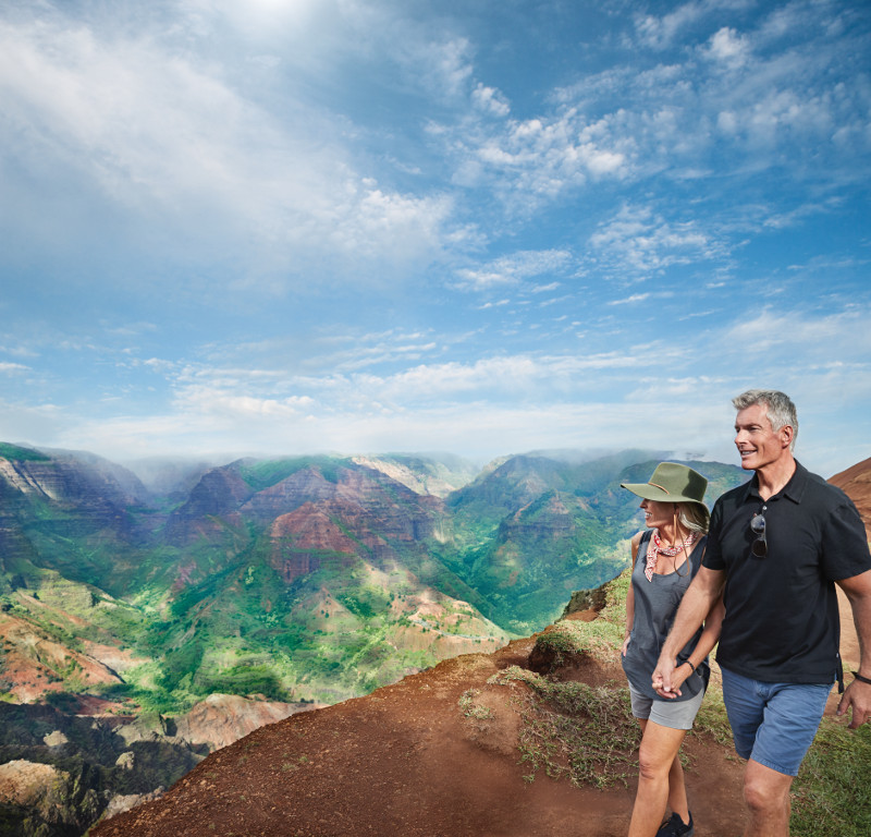 The fourth largest island in the Hawaiian group, Kauai is known as the “Garden Island.” The terrain ranges from the volcanic slopes of Mt. Waialeale and the desert-like beauty of Waimea Canyon to the Wailua River’s lush Fern Grotto. Ironically this once isolated island was the site of the first meeting between Europeans and Hawaiians. On January 19, 1778, Captain James Cook anchored his ships off the mouth of the Waimea River, becoming the first in a long line of enthusiastic visitors.