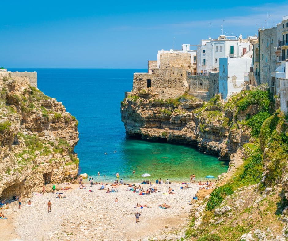 - Polignano a Mare – Cliffside Beauty: Polignano a Mare is a picturesque seaside town famous for its dramatic cliffs, crystal-clear waters, and historic centre. It’s also known for Grotta Palazzese, a restaurant in a sea cave.